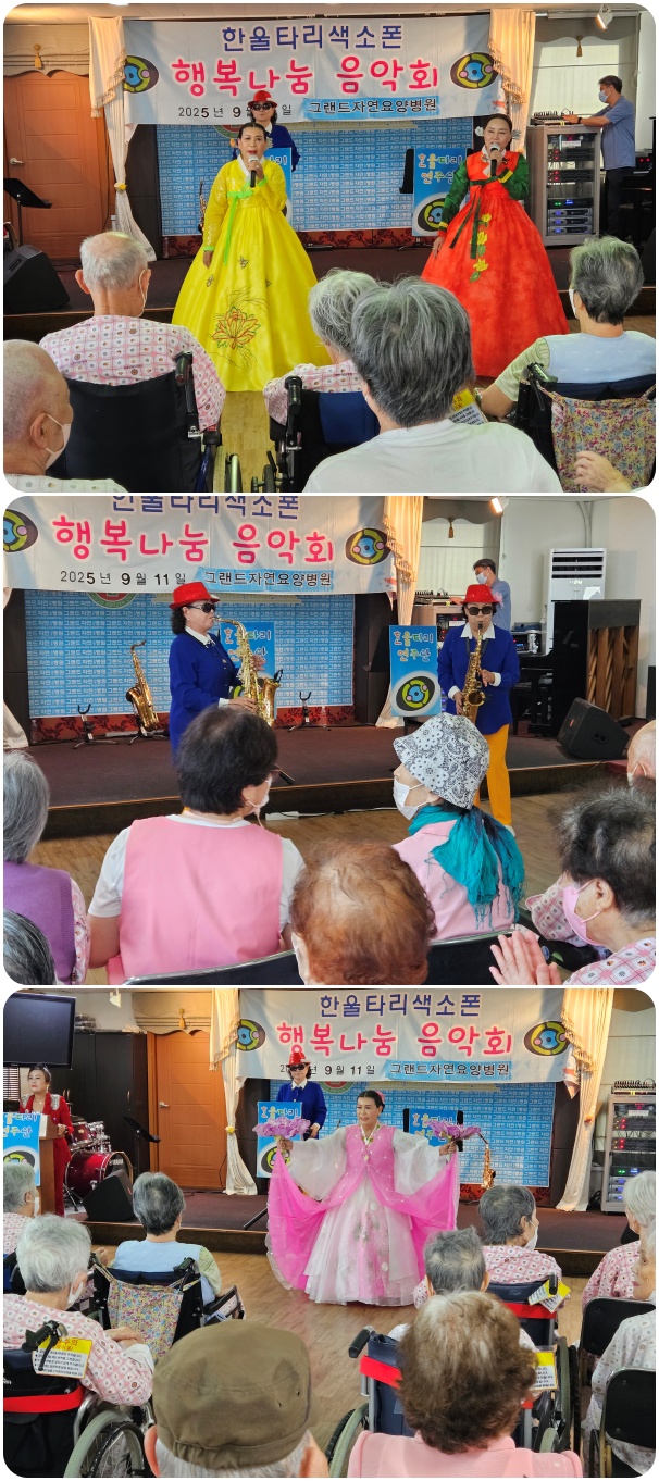 그랜드자연요양병원은 9월 11일 한울타리 색소폰의 <행복 나눔>공연으로 작은 음악회를 열었다. 이날 공연은 <해운대 엘레지>, <부산 갈매기> 등의 색소폰 연주와 <노들강변>, <진도아리랑> 등의 옛가요, 민요 등으로 어르신들과 함께 즐거운 시간을 마련했다.