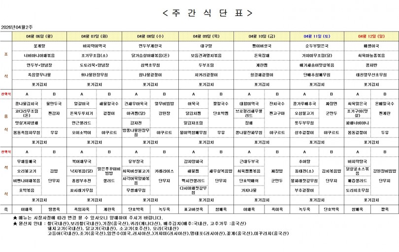 주간 식단표 (4월 2주) 페이지 정보 작성자 최고관리자 작성일26-04-03 14:50 조회115회 댓글0건 다음글 목록 본문 주간 식단표 (4월 2주) 댓글목록 등록된 댓글이 없습니다. 다음글 목록