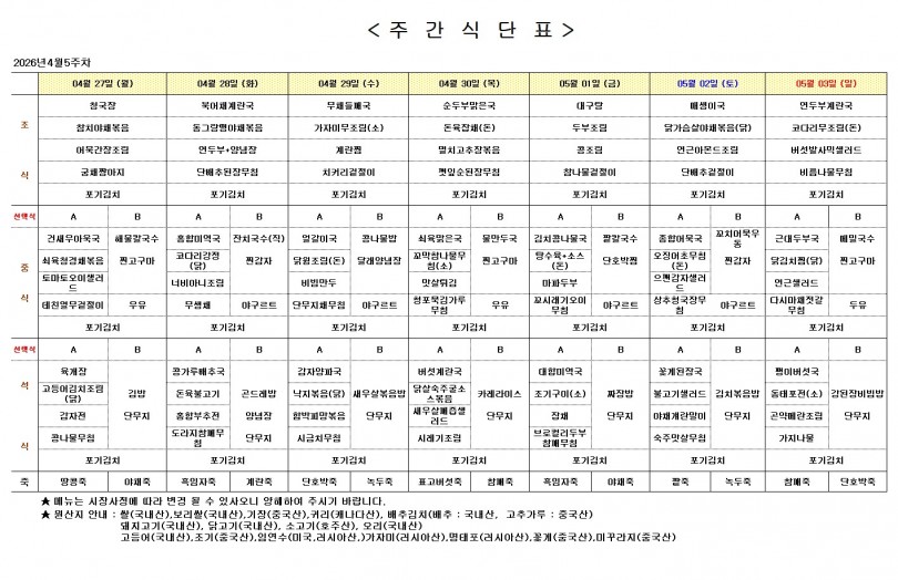 주간 식단표 (4월 5주) 페이지 정보 작성자 최고관리자 작성일26-04-24 09:47 조회94회 댓글0건 다음글 목록 본문 주간 식단표 (4월 5주) 댓글목록 등록된 댓글이 없습니다. 다음글 목록