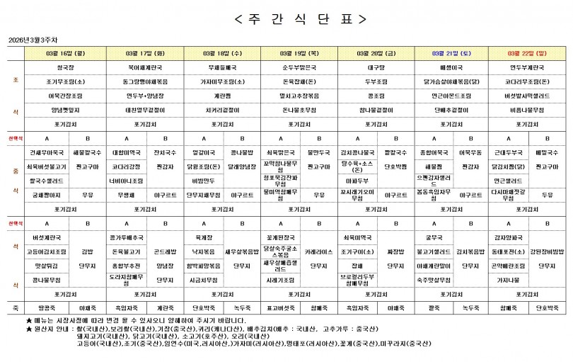 주간 식단표 (3월 3주) 페이지 정보 작성자 최고관리자 작성일26-03-13 14:01 조회20회 댓글0건 다음글 목록 본문 주간 식단표 (3월 3주) 댓글목록 등록된 댓글이 없습니다. 다음글 목록